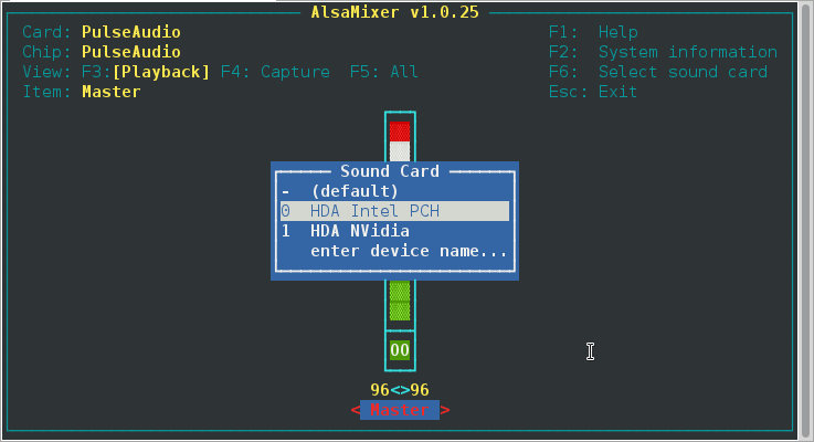 alsamixer, затем нажимаем F6 и выбираем нашу звуклвую карту.